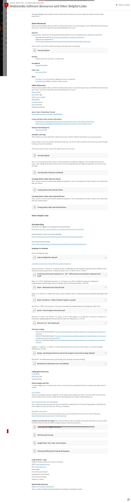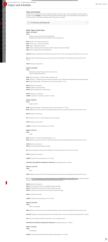 For summer term 2020, I redesigned a graduate course called Media Design: Multimedia (ETT 555) and taught it during an 8-week term. I converted the course to Blackboard Ultra view from the Original view for delivery during this term. As it turned out, the version of Blackboard Ultra used for this course was lacking in some useful functionality for both instructors and students.